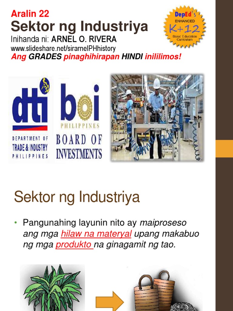 Mga trabahong kabilang sa sektor ng industriya. Sinuri natin ang kahalagahan nito sa pang-araw-araw na buhay ng mga Pilipino. KALAGAYAN NG SEKTOR NG INDUSTRIYA SA PILIPINAS Naglalayong magbigay ng benepisyo at insentibo sa sinumang dayuhan na maglalagak ng kanyang puhunan sa preferred. Kinasasangkutan ito ng paghahanda paghuhubog at pagbago ng mga materyal sa pamamagitan ng maraming mga paraan katulad ng paggupit sa hindi kailangang mga piraso pagpukpok pagbanat pagpapa-init o ginagamitan ng mga kimikalkonstruksiyonang konstruksiyon o paggawa ng gusali ay ang industriya sa paggawa o pagsasaayos ng mga estruktura o imprastruktura halimbawa ay ang bahay tulay o.