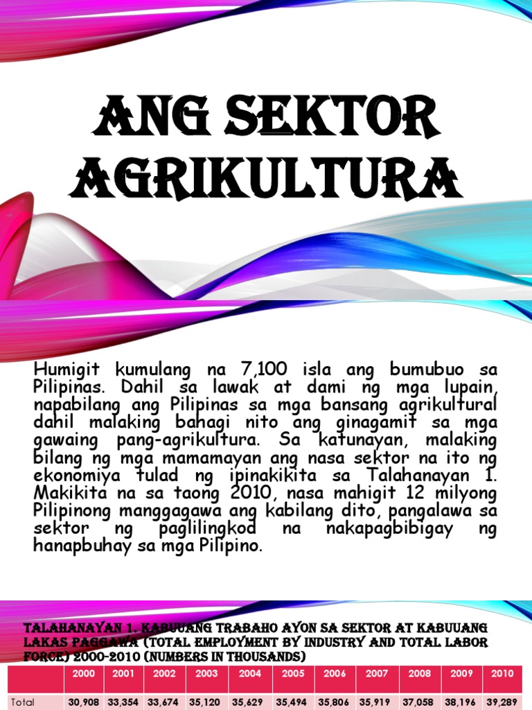 SEKTOR NG AGRIKULTURA Sa paksang ito ating alamin ang mga ibat ibang mga sektor ng agrikultura at ang kahulugan ng bawat isa. Ayon naman sa Department of Labor and Employment DOLE Bureau of Local Employment sa loob ng anim na taon mula 2012 hanggang 2017 nasa 32 milyong trabaho ang total employment share nito kada taon. Mga Nakukuha Mula sa Sektor ng Industriya.