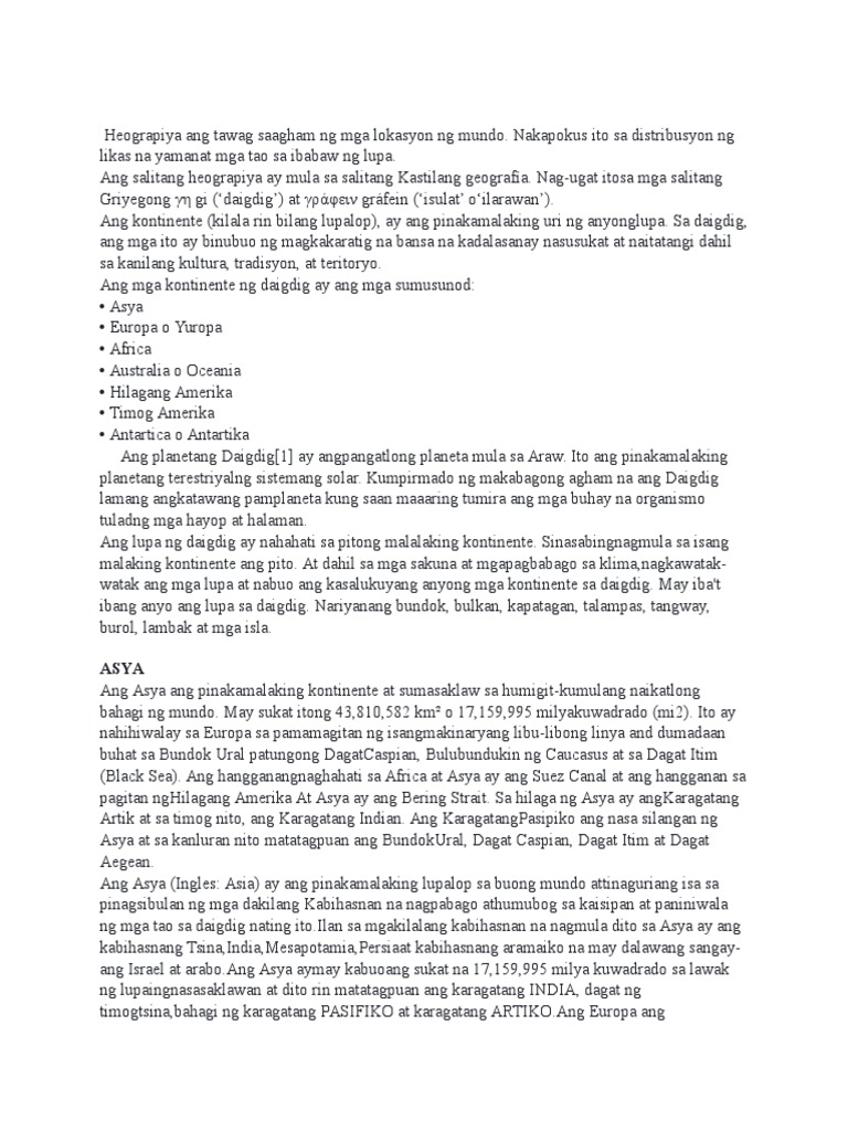 Ang kontinente ay ang pinakamalawak na masa ng lupa sa ibabaw ng daigdig. Gitnang Asya Silangang Asia Timog Asya Timog-Silangang Asya kun saan naroroon ang ating bansang Pilipinas at Kanlurang Asya. Ito ay nahahati sa limang rehiyon.