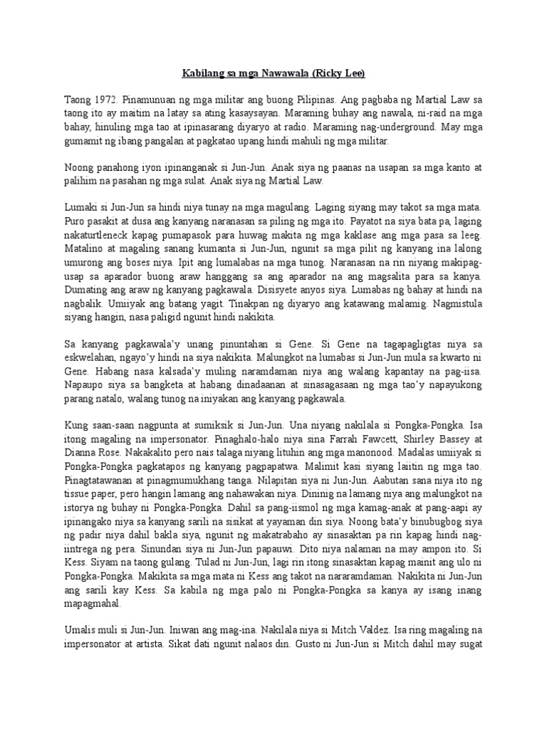 Kabilang sa mga Nawawala Grp Jeco Haleco KABILANG SA MGA NAWAWALA Ni RICARDO LEE RICKY LEE RICARDO LEE Siya ay mas kilala bilang si Ricky Lee Isang premyadong manunulat ng dulang pampelikula. Works with national and international development organizations as a humanitarian worker researcher and trainer on participatory action research and disaster risk reduction. Ang Huling Matuwid.